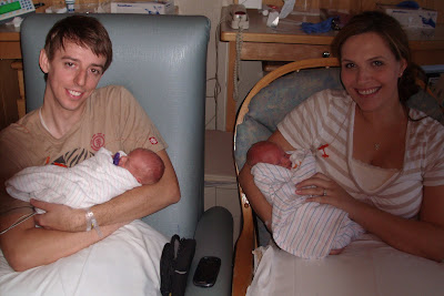 It began and Aaron and I just looked at each other thinking here we go! Right away Aaron said "It's just like the c-section video we saw!" haha I didn't think he would watch as much as he did but he did great! Pretty soon baby A was out and my doctor held him over the blue curtain so I could see him and there was the tiniest little baby staring right at me with eyes wide open and arms held out. It was absolutely so precious! Two minutes later baby B was out and held over the curtain with eyes open! I couldn't believe that it was over. Everyone was saying how good they looked for being born at 31 weeks and they all started laughing because they started peeing on each other! haha So right away we told them that baby A was going to be named Luke and baby B was going to be Jonah. It was perfect. Turns out baby A was NOT breech but was so far down in the canal that the other doctor thought he was because they could only see his butt! I was a little irritated to hear that at first but then they said it was good that we had a C-Section because baby B was so far up in me that they had to tug and pull him out. I would've had to have a C-section anyways to get him out. It worked out for the best.
